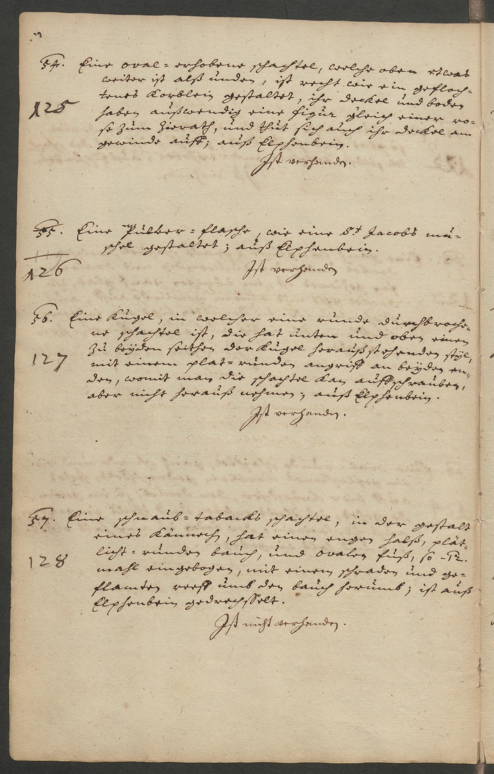 57. 121 128 Eine schnaub-tabacks schachtel, in der gestalt/ eines kännechn, hat einen engen halß, plät=/licht=runden bauch, und ovalen fuß, so 12./ mahl eingebogen, mit einem schraden und ge=/flamten reeff umb den bauch herumb; ist auß/ Elphenbein gedrechsselt./ Ist nicht vorhanden.
