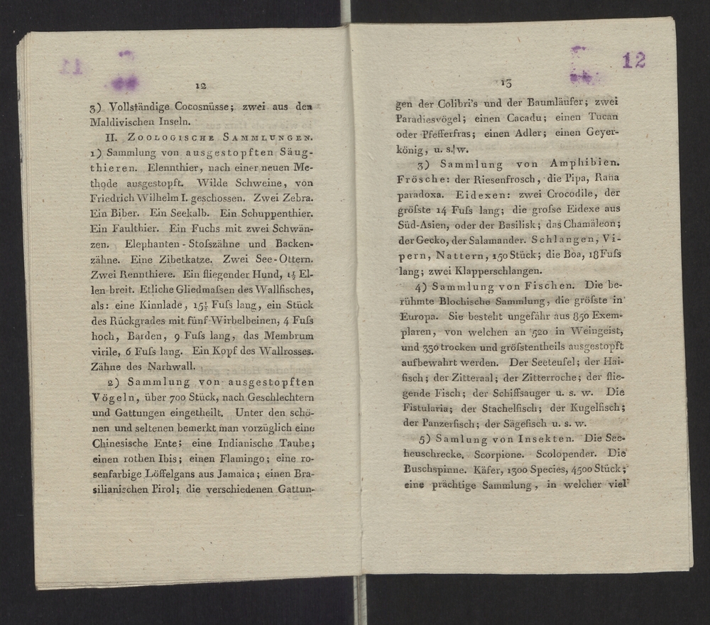 Die berühmte Blochische Sammlung, die größte in Europa. Sie besteht ungefähr aus 850 Exemplaren, von welchen an 520 in Weingeist, und 350 trocken und größtentheils ausgestopft aufbewahrt werden.