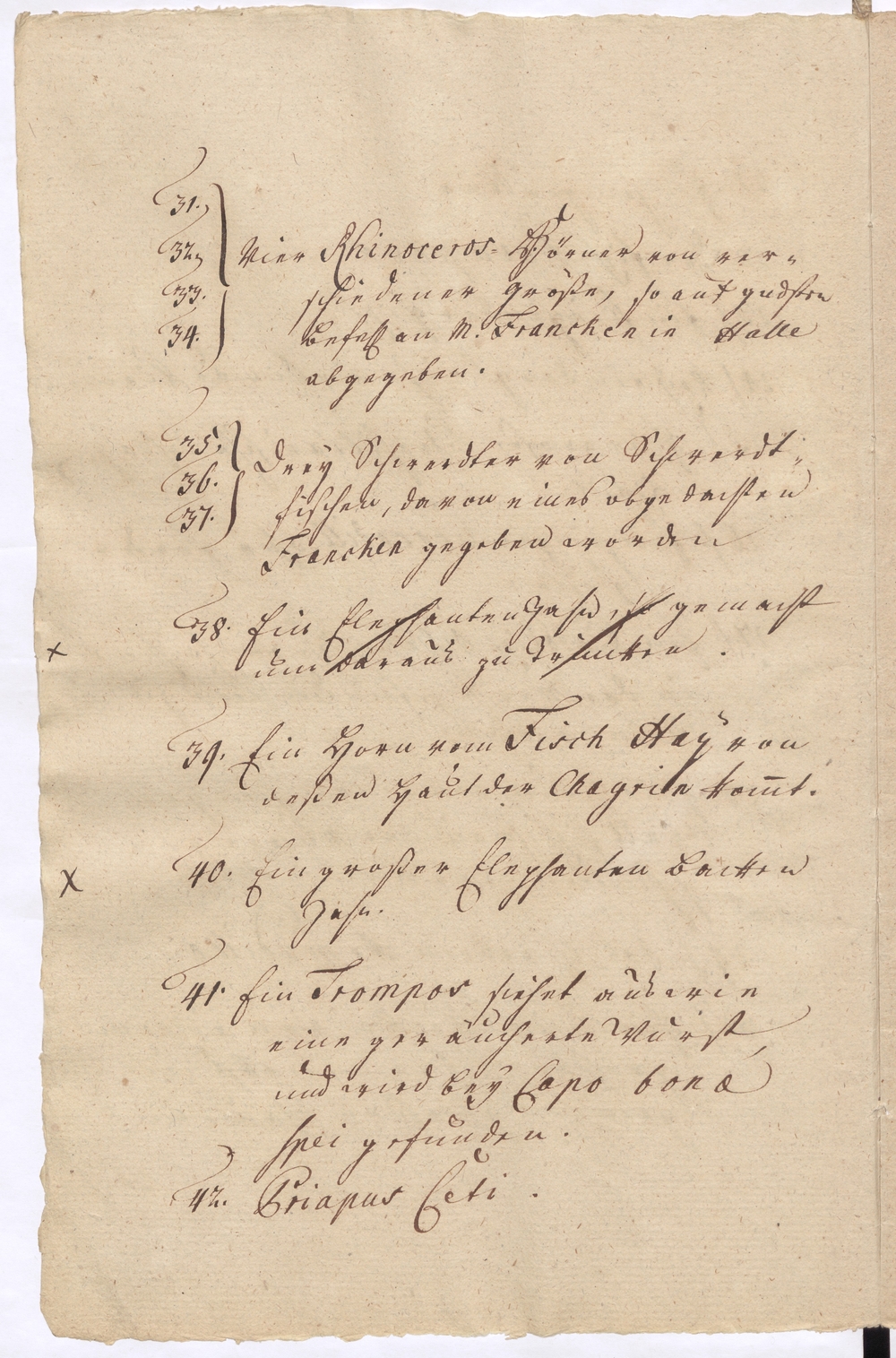 31. 32. 33. 34 } Vier Rhinocerus-Hörner von ver-/schiedener Größe, so auf gndst./ Befehl an M. Francken in Halle abgegeben./