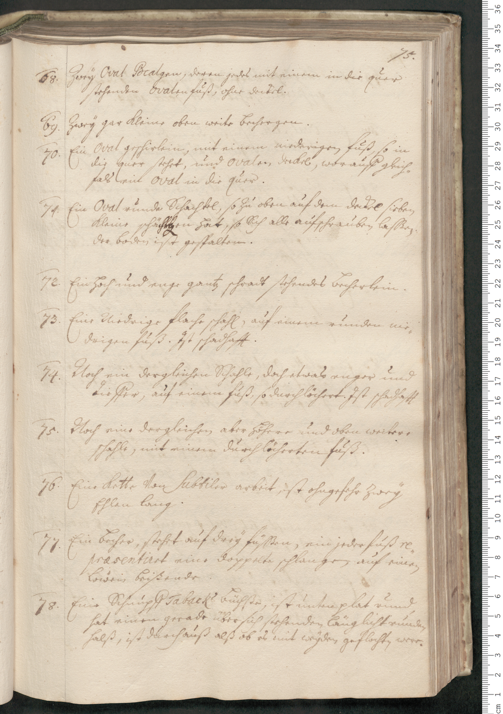 78. Eine Schnupff Tabacks Büchße, ist unten plat rund,/ hat einen gerade über sich stehenden länglicht runden/ halß, ist durchauß alß ob es mit weyden geflochten were.
