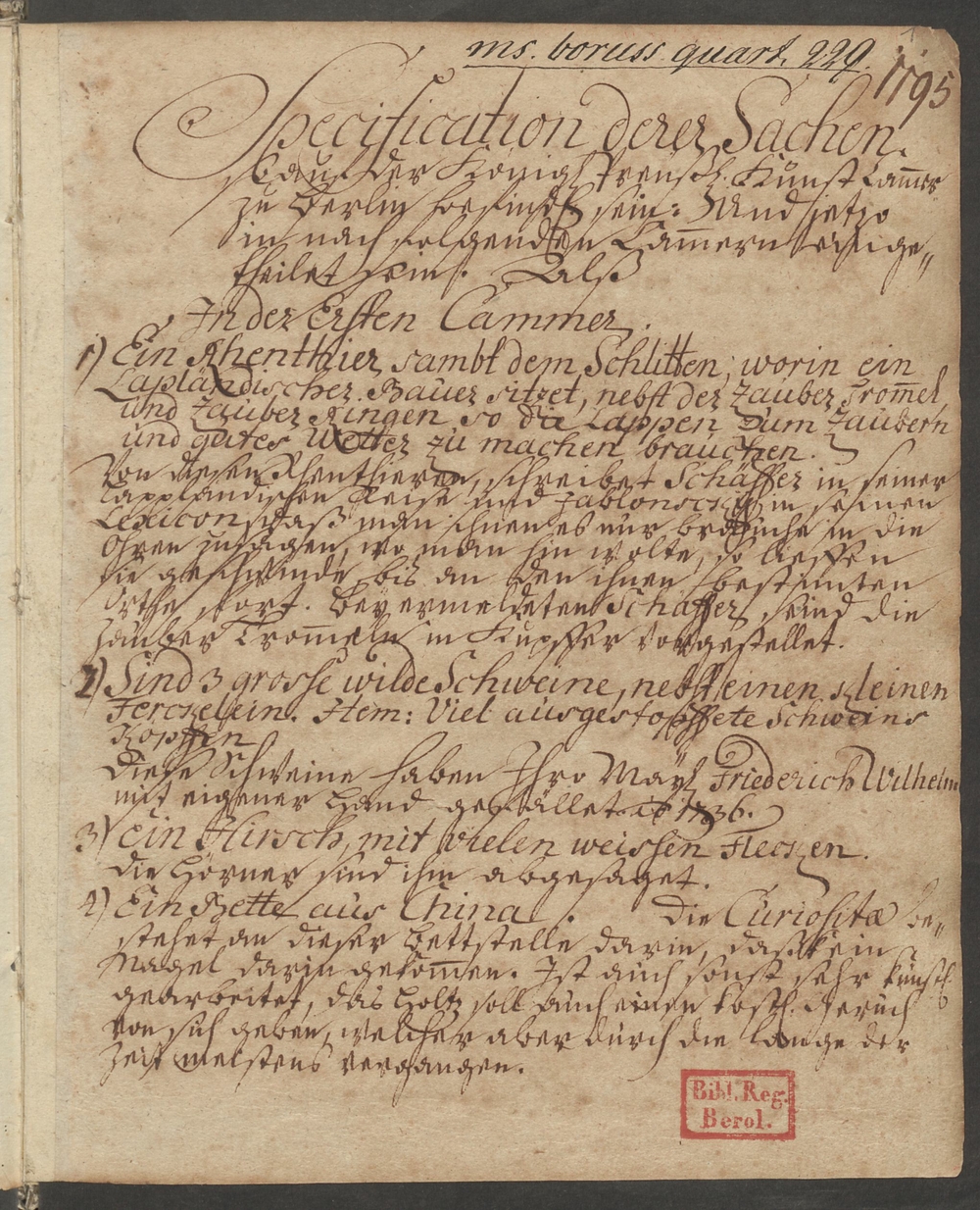 Zwischen 1742 und 1752 entstandene und nach Räumen eingeteilte Specification derer Sachen so auf der Königl. Preuß. Kunst Cammer zu Berlin befindl. sein im Rahmen eines Sammelbandes über „Curiositeten“ in Berlin. Sie bildet den ersten von vier Teilen, wobei Teil 2 die Bibliothek, Teil 3 die Rüstkammer und Teil 4 Bevölkerungszahlen von Berlin enthält, und listet für die Kunstkammer eine Auswahl von 169 Objekten. Die Objekteinträge wurden wohl vor dem Besuch des Verfassers in lateinischen Buchstaben angelegt. Darunter wurde Platz gelassen, um die Einträge vor Ort (oder nach dem Besuch) mit weiteren Informationen (in Kurrentschrift) zu ergänzen.