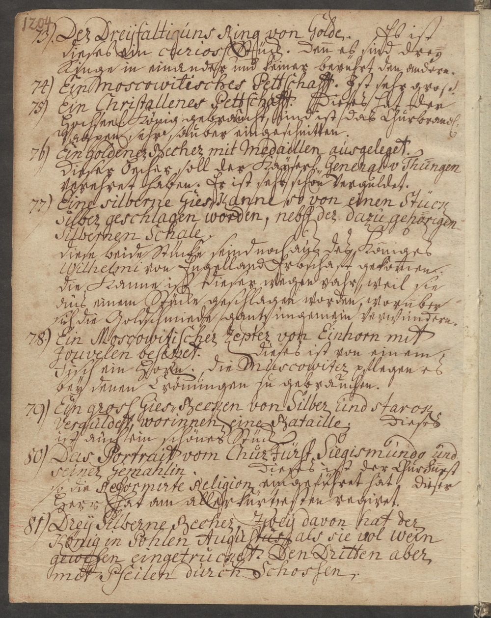77. Eine silberne Gieß=Kanne so von einen Stück Silber geschlagen worden, nebst der dazu gehörigen/ Silbernen Schale./ [Ergänzung:] Diese beide Stücke sind noch aus des Königes/ Wilhelm von Engelland Erbschaft gekommen./ Die Kanne ist dieser wegen rahr, weil sie/ aus einem Stücke geschlagen worden, worüber/ sich die Goldschmiede gantz ungemein verwundern.