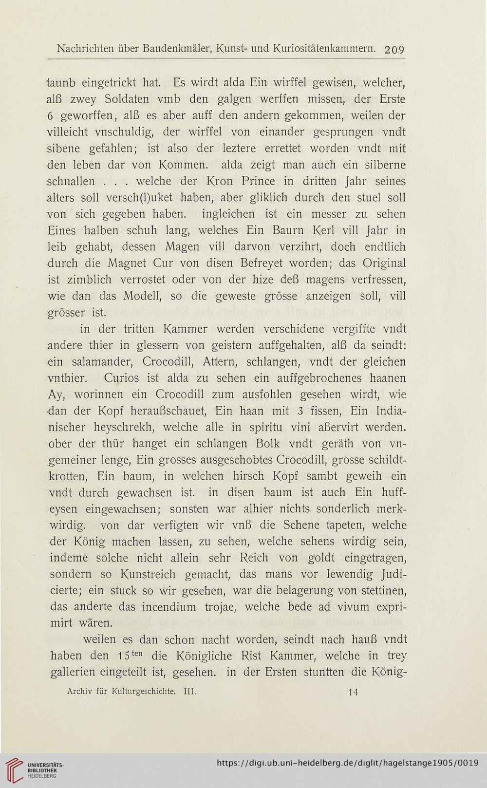in der tritten Kammer werden verschidene vergiffte vndt/ andere thier in glessern von geistern auffgehalten, alß da seindt:/ ein salamander, Crocodill, Attern, schlangen, vndt/ der gleichen vnthier. Curios ist aida zu sehen ein auffgebrochenes haanen/ Ay, worinnen ein Crocodill zum ausfohlen gesehen wirdt, wie/ dan der Kopf heraußschauet, Ein haan mit 3 fissen. Ein India-/nischer heyschrekh, welche alle in spiritu vini aßervirt werden./ ober der thür hanget ein schlangen Bolk vndt geräth von vn-/ gemeiner lenge, Ein grosses ausgeschobtes Crocodill, grosse schildt-/krotten. Ein bäum, in welchen hirsch Kopf sambt geweih ein/ vndt durch gewachsen ist. in disen bäum ist auch Ein huff-/ eysen eingewachsen; sonsten war alhier nichts sonderlich merk-/ wirdig. von dar verfigten wir vnß die Schene tapeten, welche/ der König machen lassen, zu sehen, welche sehens wirdig sein,/ indeme solche nicht allein sehr Reich von goldt eingetragen,/ sondern so Kunstreich gemacht, das mans vor lewendig Judi-/ cierte; ein stuck so wir gesehen, war die belagerung von stettinen,/ das anderte das incendium trojae, welche bede ad vivum expri-/mirt wären./ weilen es dan schon nacht worden, seindt nach hauß vndt haben den 15ten die Königliche Rist Kammer, welche in trey/ gallerien eingeteilt ist, gesehen, in der Ersten stuntten die König
