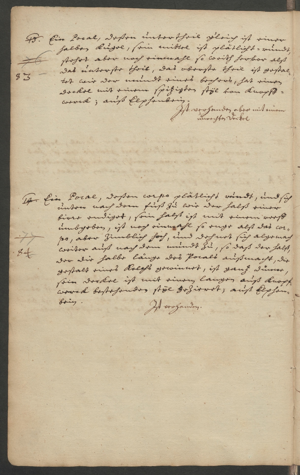 14. 77 84 Ein Pocal, deßen corpo plätlicht rundt, und sich/ unten nach dem fuß zu wie der halß einer/ birne rundiget, sein halß ist mit einem reeff/ umbgeben, ist noch einmahl so enge alß das cor=/po, aber ziemblich hoch, und dehnet sich algemach/ weiter auß nach dem mundt zu, so daß der halß,/ der die halbe länge des Pocals außmacht, die/ gestalt eines Kelchs gewinnet, ist gantz dünne,/ sein Deckel ist mit einem langen auß Knopf=/werck bestehenden styl gezieret; auß Elphen=/bein./