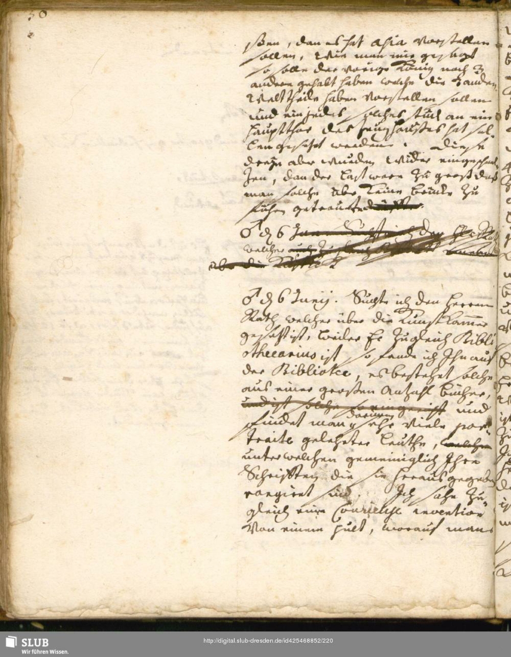 ♂ d. 6. Junij. Suchte ich den Herren Rath welcher über die Kunstkammer gesezt ist, [weiler?] Er zugleich Bibliothecarius ist so fande ich Ihn auf der Bibliotec, es bestehet solche aus einer großen Anzahl Bücher, und ist solche so […] und findet man darinnen sehr viele portraite gelehrter Leuthe, welche unter welchen gemeiniglich Ihre Schriften die sie herausgegeben rangiret sind. Ich sahe Zugleich eine Courieuse invention von einem pult, worauf man