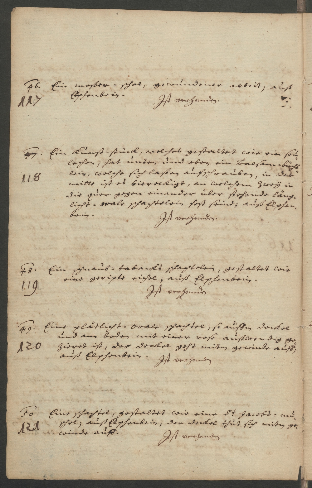 50. 114 121 Eine schachtel, gestaltet wie eine St. Jacobs=mu=/schel; auß Elphenbein, der Deckel thut sich mitm ge=/winde auff./ Ist vorhanden