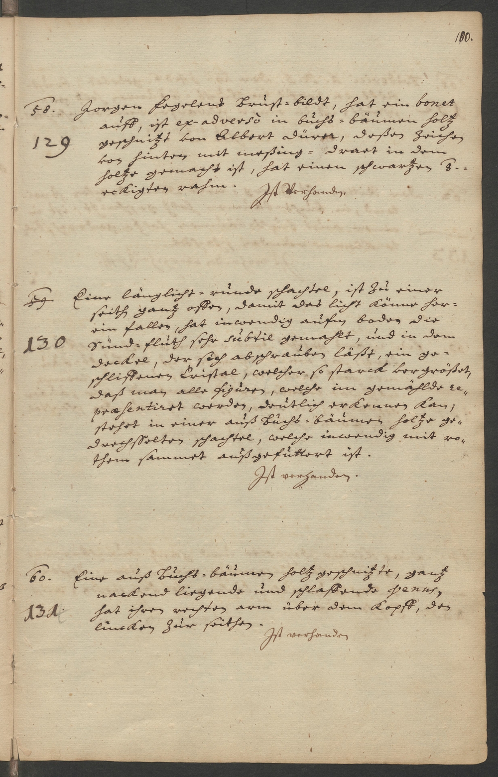 58. 122 129 Jorgen Fegelens Brust-bildt, hat ein bonet/ auff, ist ex-adverso in buchs=bäumen holtz/ geschnitzt von Albert dürer, deßen zeichen/ von hinten mit meßing=draet in dem/ holtze gemacht ist, hat einen schwartzen 8./=eckigten rahm./ Ist vorhanden./