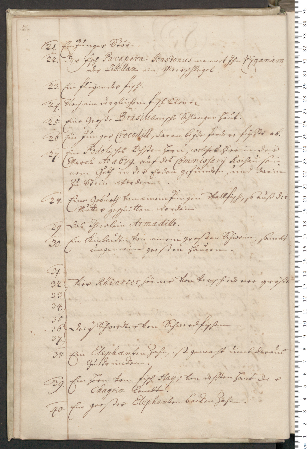 27. Ein Podolisches Ochsenhorn, welches hier in der/ Marck Ao. 1679 auf des Commissarii Rochau sei=/nem Guth in der Erden gefunden und darin/ zu Stein worden./
