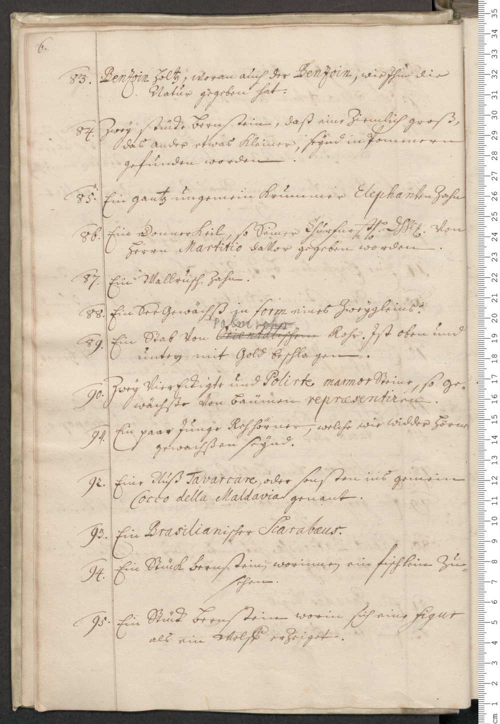 89. Ein Stab von Palmrohr [mit Bleistift darüber geschrieben, darunter/durchgestrichen: Orientalisches] Reh. Ist oben und/ unten mit Gold beschlagen./