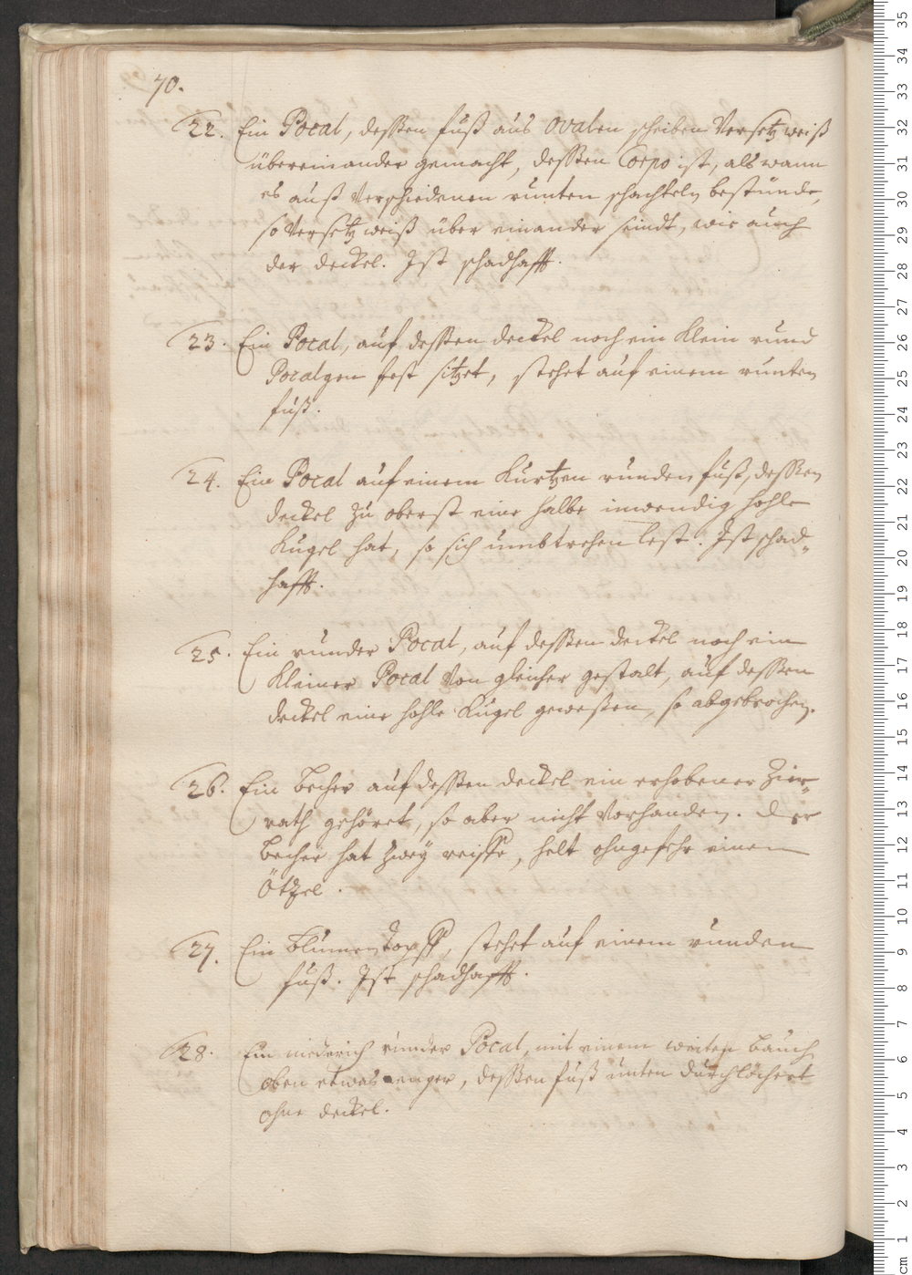 28. Ein niederich runder Pocal, mit einem weiten Bauch,/ oben etwas enger, desßen fuß unten durchlöchert/ ohne Deckel.