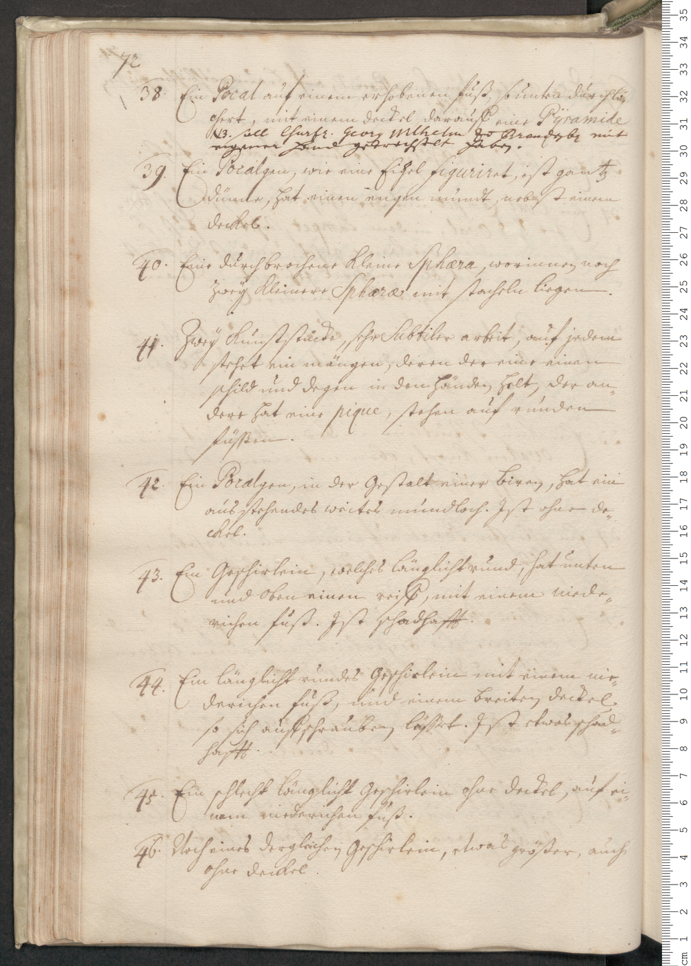 38. Ein Pocal auf einem erhobenen fuß, so unten durchlö=/ chert, mit einem Deckel, darauff eine Pÿramide/ [nachträglich hinzugefügt:] NB. soll Churft. Georg Wilhelm zu Brandenbg mit/ eigener Hand gedrechselt haben./