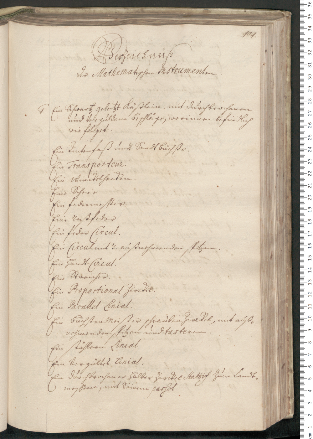 1. Ein Schwartz gebeitzt Kästlein, mit durchbrochenen/ und verguldem Beschläge, worinnen befindlich/ wie folget./ Ein Tintenfaß undt Sandtbüchße./ Ein Transporteur./ Ein Winckelhacken./ Eine Schere/ Ein Federmesser/ Eine Reißfeder/ Ein Feder Circul./ Ein Circul mit 3. außnehmenden Spitzen./ Ein Handt Circul./ Ein Streicher./ Ein Proportional Zirckel./ Ein Parallel Linial./ Ein Büchßen Meister schrauben Zirckel, mit auß=/ nehmenden Spitzen und [tasteren]./ Ein stählern Linial./ Ein vergültes Linial./ Ein durchbrochener Halber Zirckel Stattif zum Landt=/ mesßen, mit Seinem passol.