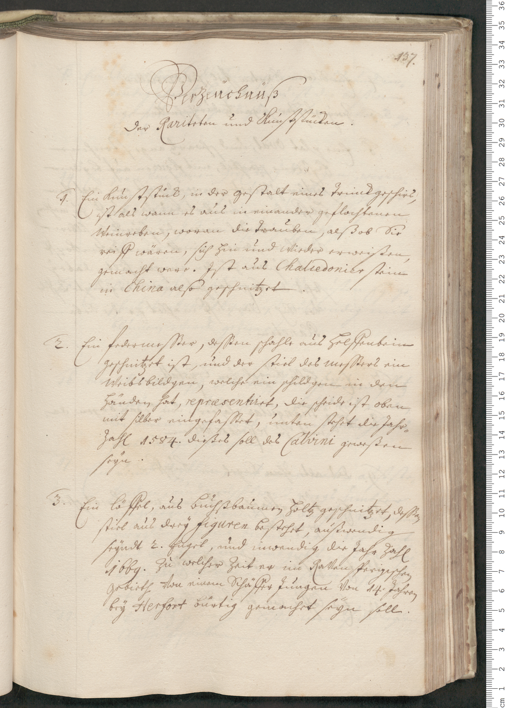 1. Ein Kunststück, in der gestalt eines Trinckgeschirs,/ ist als wann es aus ineinander geflochtenen Weinreben, woran die Trauben, alß ob sie reiff wären, sich hin und wieder erweißen, gemacht/ were. Ist aus Chalcedonier Stein/ in China also geschnitzet./