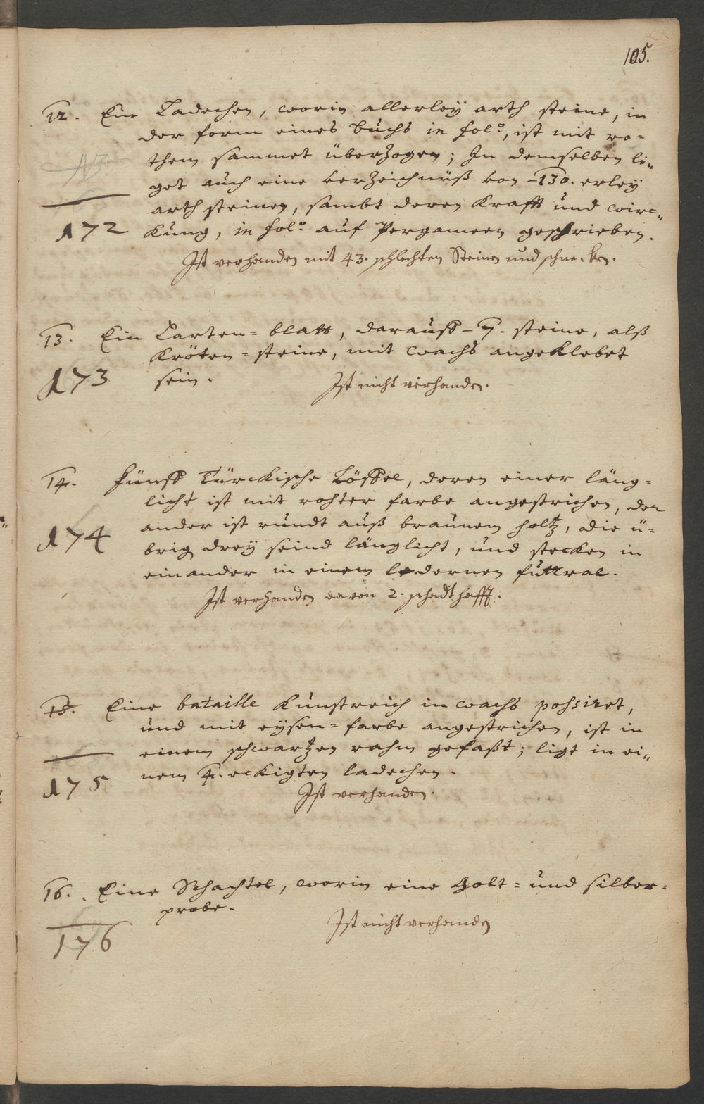 12. NB165 172 Ein Ladechen, worin allerley arth steine, in/ der form eines buchs in fol., ist mit ro=/them sammet überzogen; In demselben lie=/get auch eine verzeichnüß von 130. erley/ arth steinen, sambt deren krafft und wirc=/kung, in fol. auf Pergameen geschrieben./ Ist vorhanden mit 43. schlechten Steinen und […]./