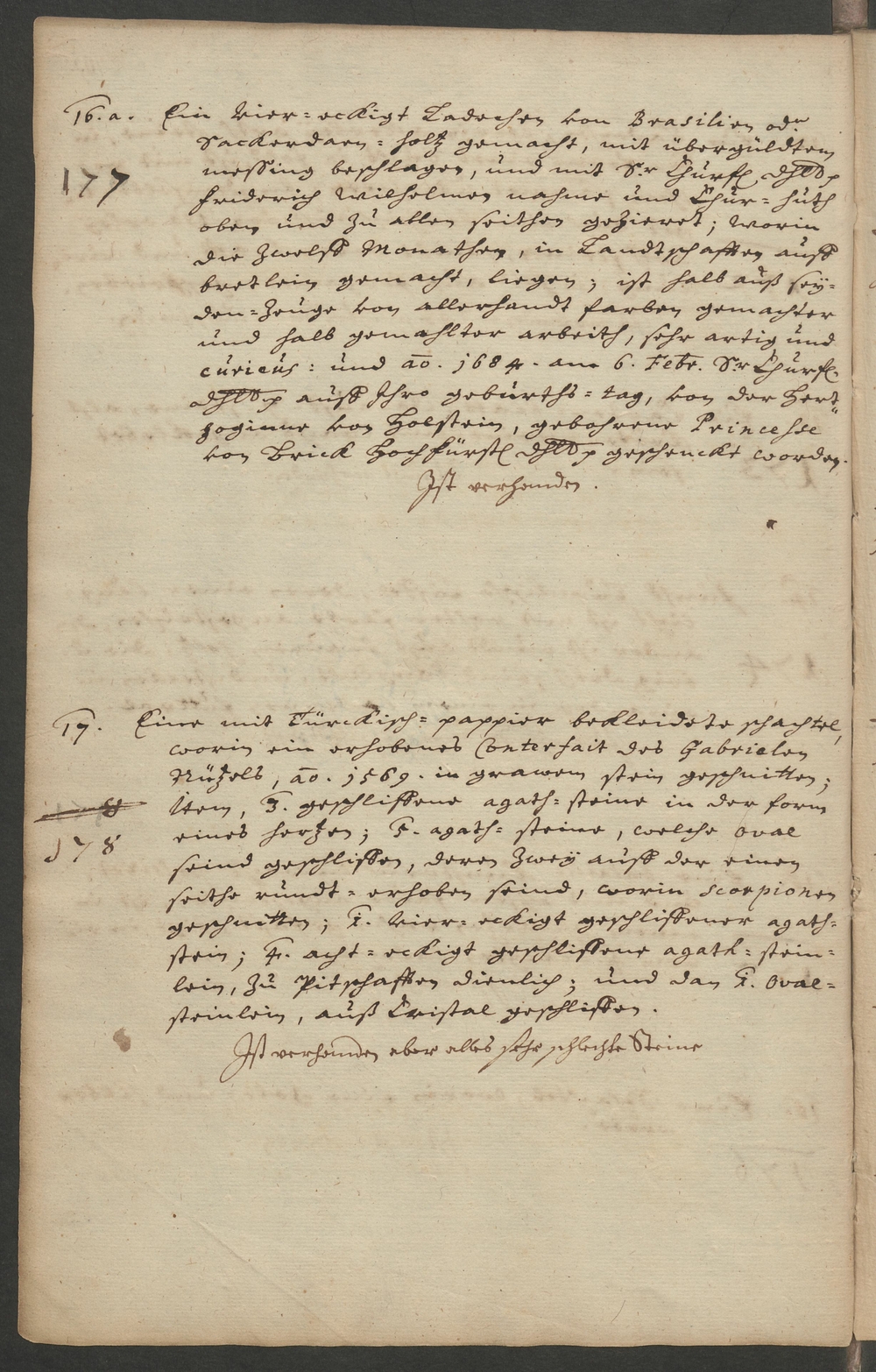 16.a. 170 177 Ein viereckigt Ladechen von Brasilien od./ Sauerdorn=holtz gemacht, mit übergüldtem/ messing beschlagen, und mit Sr Churfsl. Dhl. p/ Friedrich Wilhelmen nahme und Chur=huth/ oben und allen seithen gezieret; worin/ die zwelff monathen, in Landtschaften auff/ bretlein gemacht, liegen; ist halb auß sey=/den=zeuge von allerhandt farben gemachter/ und halb gemahlter arbeith, sehr artig und/ curieus. und ao 1684 am 6. Febr. Sr. Churfl./ Dhlt. p auff Ihro geburths=tag, von der Hert=/zoginne von Holstein, gebohrene Princesse/ von Brick Hochfürstl. Dhlt p geschenckt worden./ Ist vorhanden/