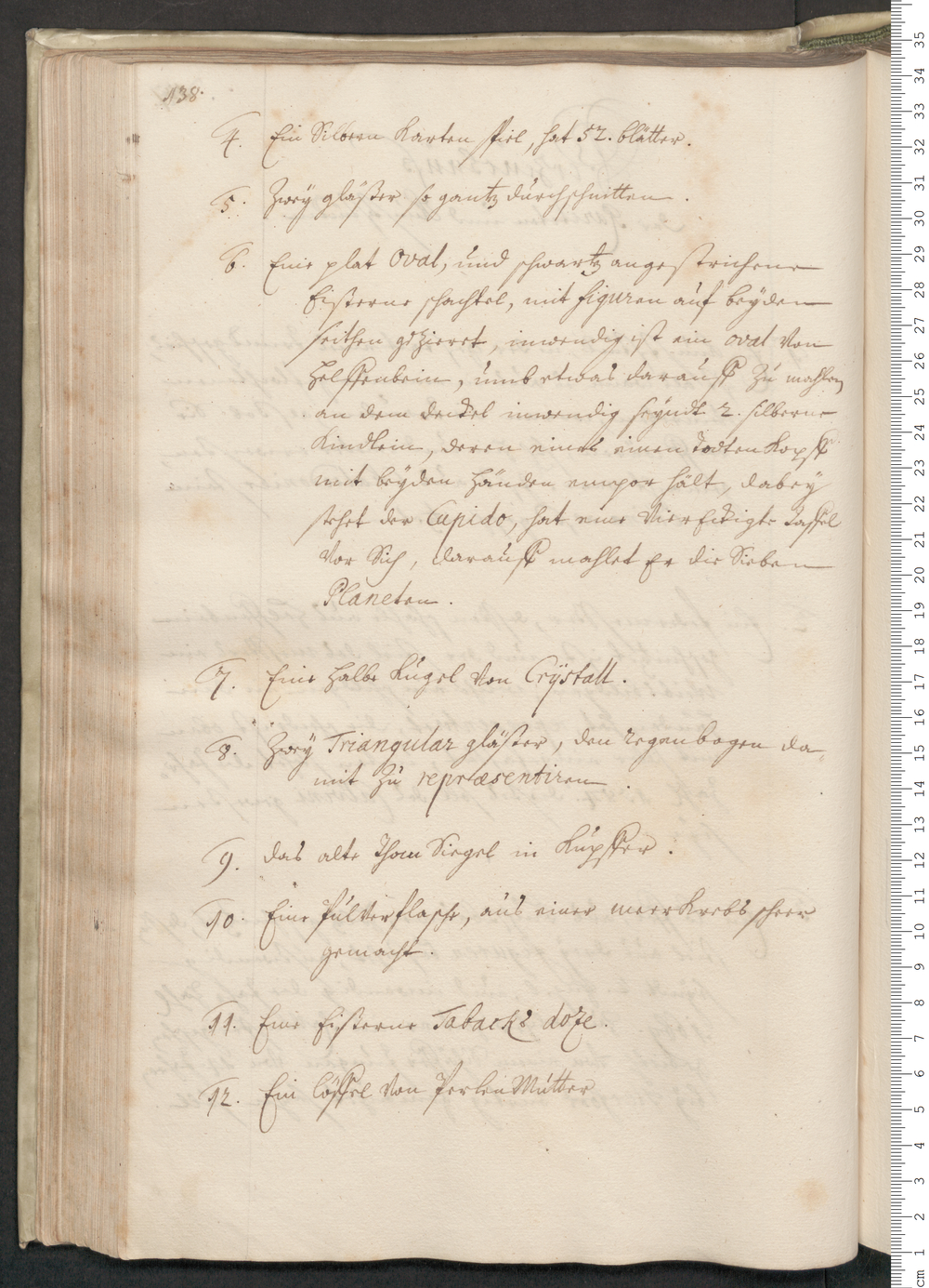 6. Eine plat Oval, und schwartz angestrichene/ Eißerne schachtel, mit figuren auf beyden/ Seithen gezieret, inwendig ist ein oval von/ Helffenbein, und etwas darauff Zu mahlen/ an dem deckel inwendig seyndt. 2 Silberne/ Kindlein, deren eines einen Todtenkopf/ mit beyden Händen empor hält, darbey/ stehet der Cupido, hat eine viereckigte Taffel/ vor sich, darauff mahlet er die sieben/ Planeten./