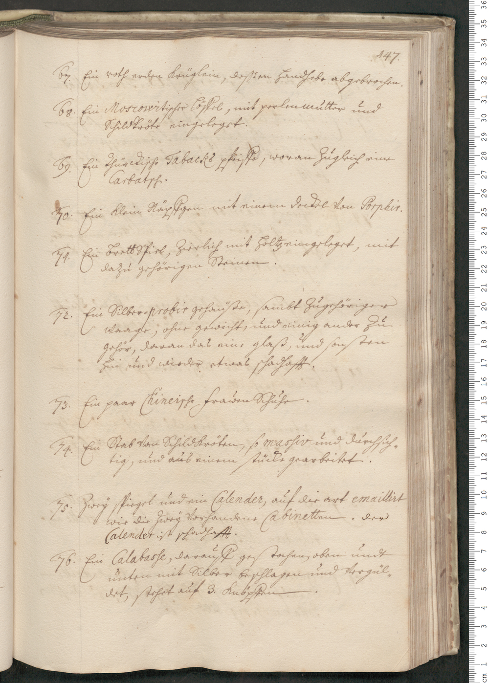 76. Ein Calabasse, darauff gestochen, oben undt/ unten mit Silber beschlagen und vergül=/det, stehet auf 3. Knöpffen.