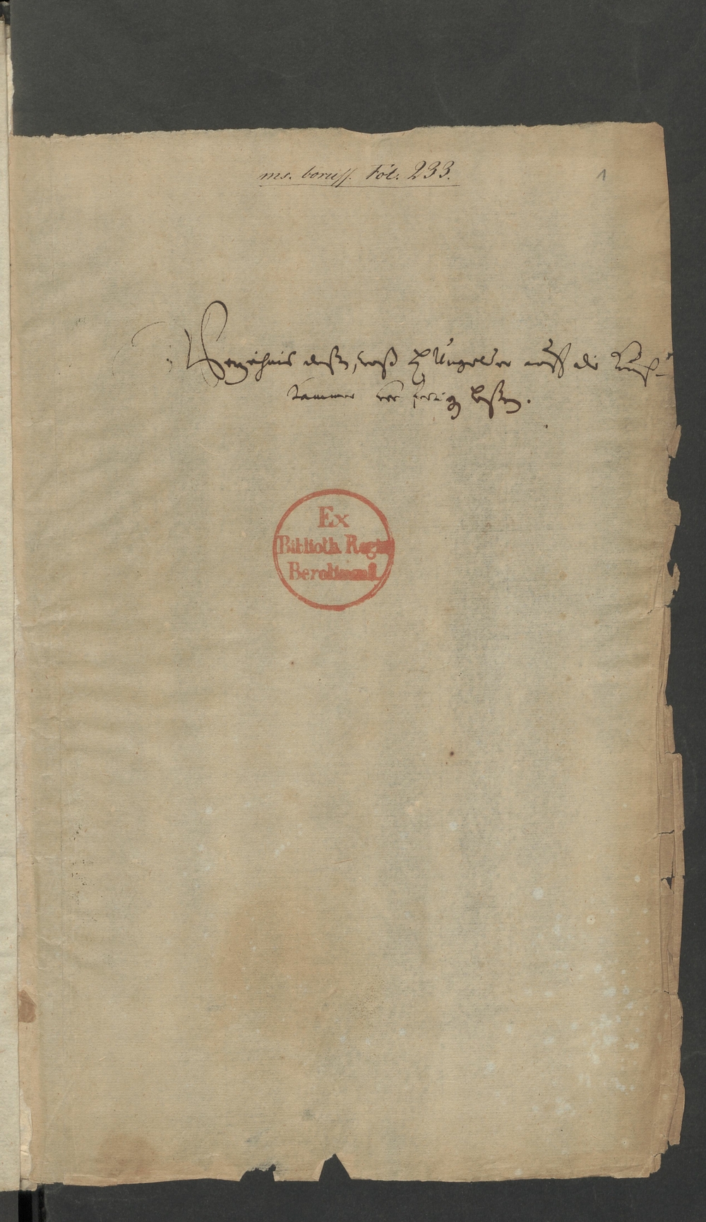 [Besitzstempel in roter Farbe, rund, mit doppelter Linie, also von 1795-1840 (siehe Staatsbibliothek Berlin, Besitzstempel von 1795 bis heute)]: Ex Biblioth. Regia Berolinensis.
