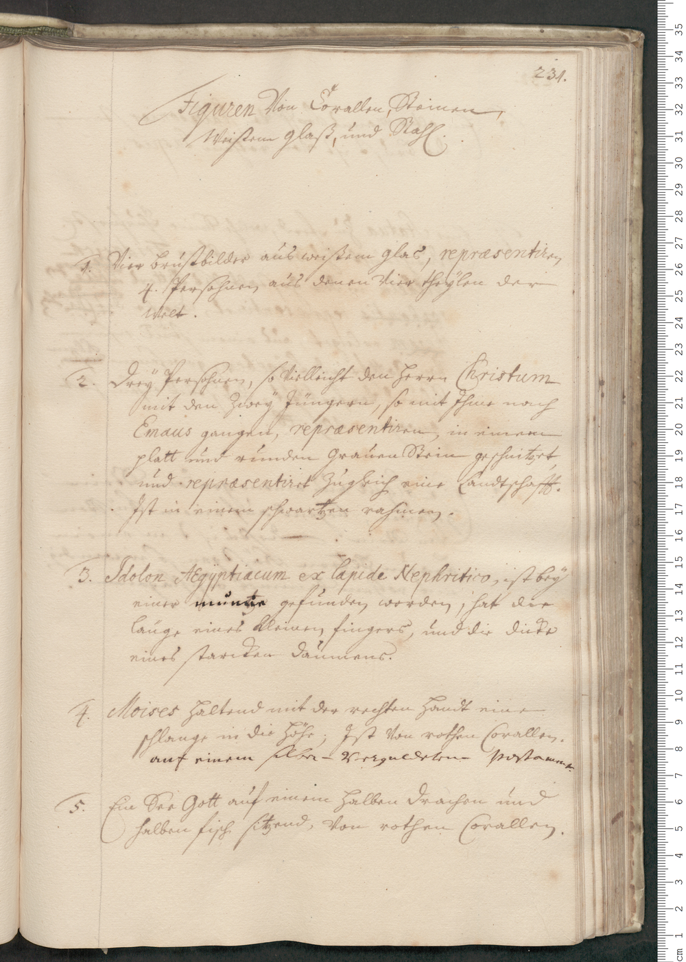 3. Idolon AEgyptiacum ex lapide Nephritico, ist bey/ einer mumie [«mumie» in anderer Tinte über wohl ein anderes Wort geschrieben] gefunden worden, hat die/ länge eines kleinen fingers, und die dicke/ eines starcken daumens./