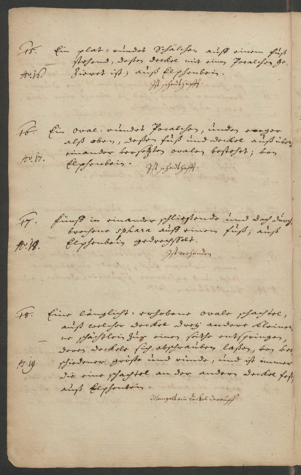 16. No.17. Ein oval=rundes Pocalchen, unden enger/ alß oben, deßen fuß und Deckel auß über=/einander versetzten ovalen bestehet; von/ Elphenbein./ Ist schadthafft./