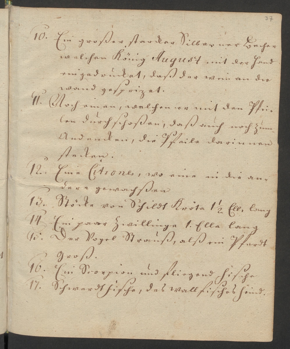 10. Ein großer starker Silberner Becher/ welchen König August mit der Hand/ eingedrücket, daß der wein an die/ wand gesprizet./