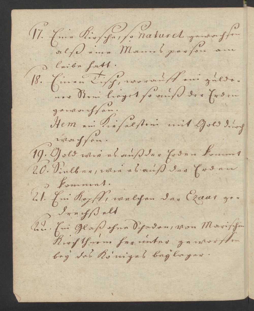 18. Einen Tisch, worauff ein gulde-/ner Stein lieget so auß der Erden/ gewachsen./ Item ein Kieselstein mit Gold durch/ wachsen./