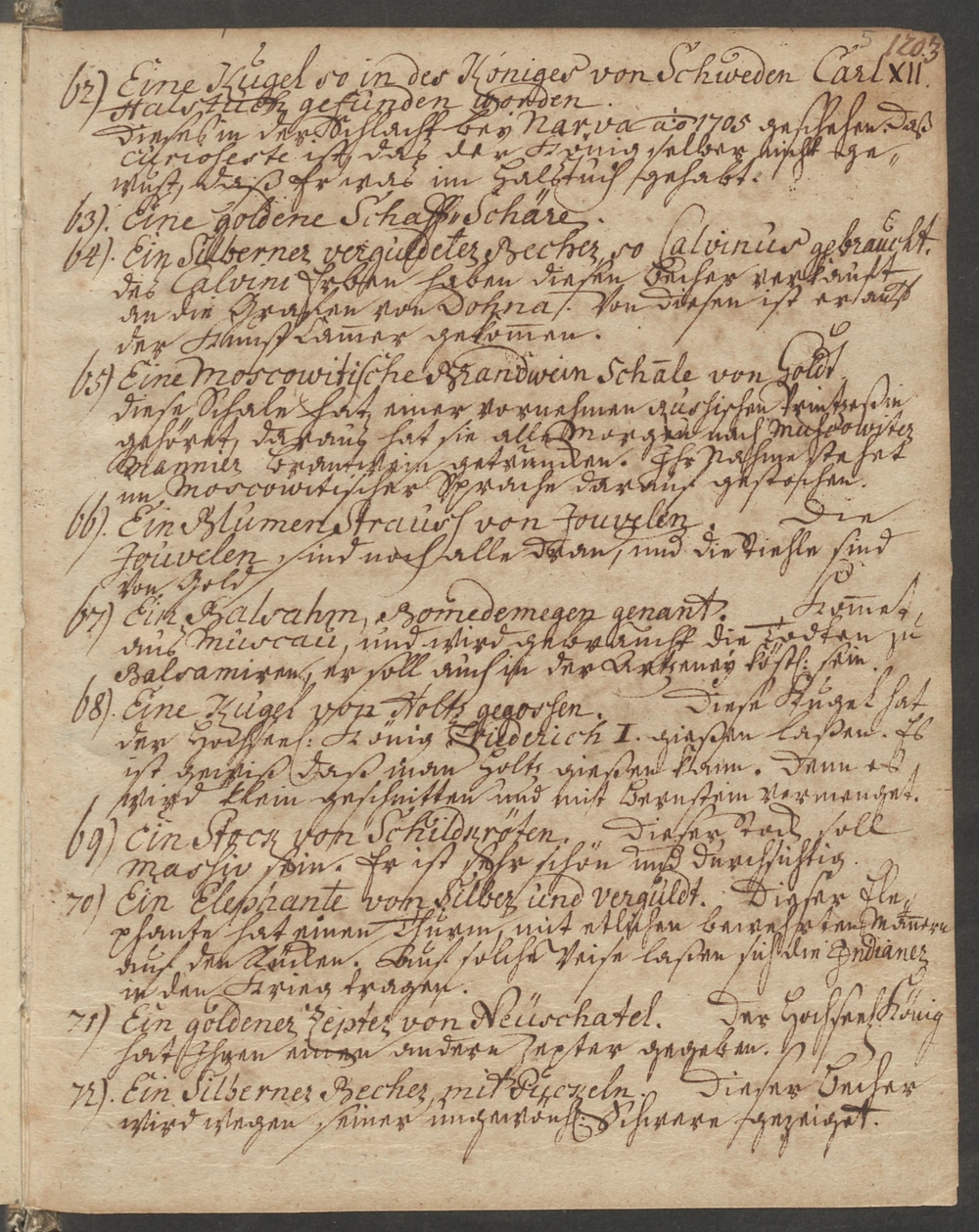 62. Eine Kugel so in des Königes von Schweden Carl XII./ Halstuch gefunden worden./ [Ergänzung:] Dieses in der Schlacht bey Narva anno 1705 [eigentlich 1700] geschehen. Daß/ Curioseste ist das der König selber nicht ge=/wußt, daß Er was im Halstuch gehabt.