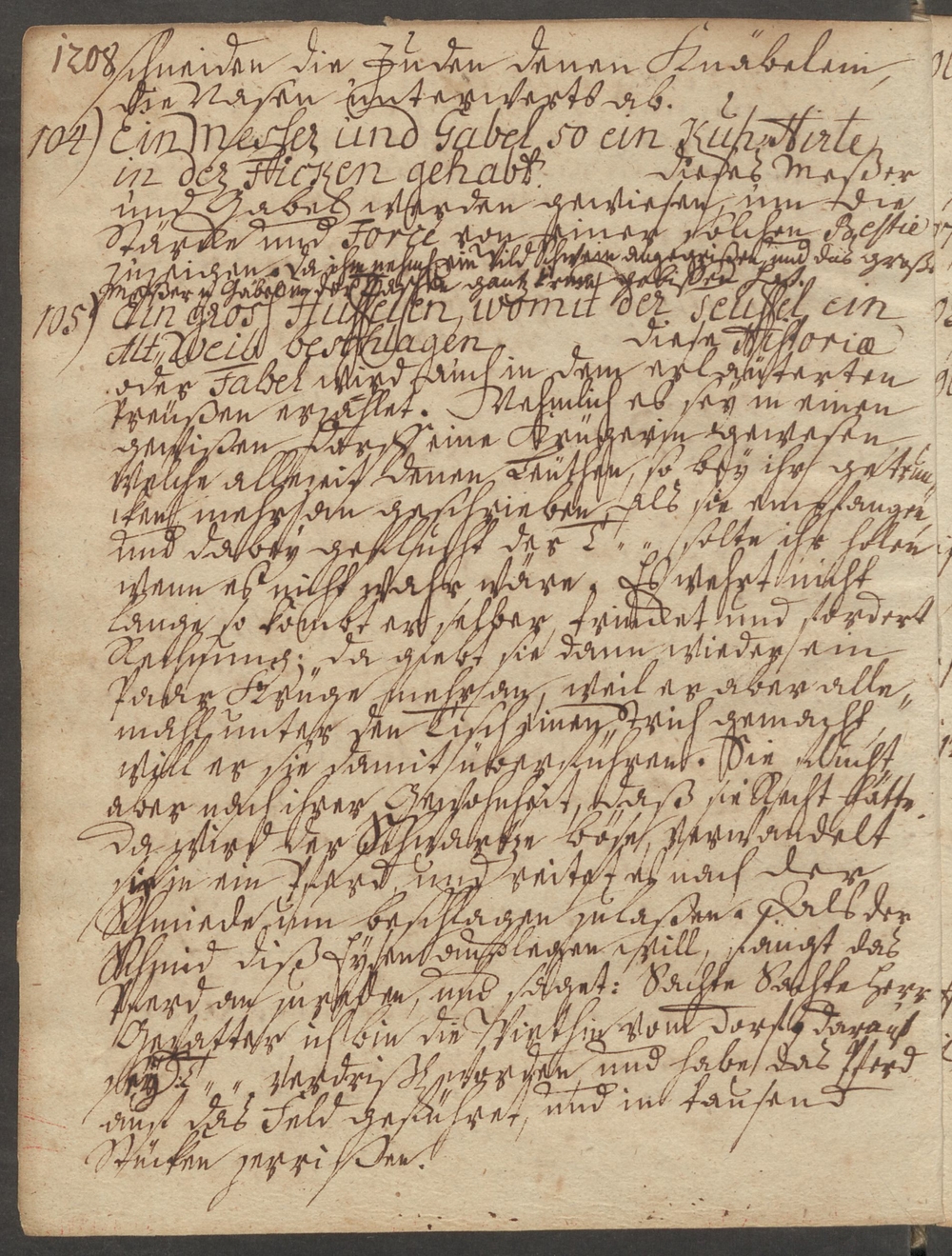 105. Ein gross Huffeisen, womit der Teuffel ein/ Alt=weib beschlagen. [Ergänzung:] Diese Historia/ oder Fabel wird auch in dem erläuterten/ Preußen erzählt. [Erleutertes Preußen Oder Auserlesene Anmerckungen, Ueber verschiedene Zur Preußischen Kirchen- Civil- und Gelehrten-Historie gehörige besondere Dinge, 1741/42] Nehmlich es sey in einen/ gewißen Dorff eine Krügerin gewesen/ welche allezeit denen Leuthen, so bey ihr getrun/ken mehr angeschrieben, als sie empfangen/ und dabey geflucht der T… solte ihr holen/ wenn es nicht wahr wäre. Es wahrt nicht/ lange so kombt er selber, trincket und fordert/ Rechnung; da giebt sie dann wieder ein/ Paar Krüge mehr an, weil er aber alle=/mahl unter den Tisch einen Strich gemacht,/ will er sie damit überführen. Sie ruft/ aber nach ihrer Gewohnheit, daß sie Recht hätte./ Da wird der Schwartze böse, verwandelt/ sie in ein Pferd, und reitet es nach der/ Schmiede um beschlagen zulaßen. Als der/ Schmid diß Eysen aufschlagen will, fängt das/ Pferd an zureden, und saget: Sachte Sachte Herr/ Gevatter ich bin die Wirthin vom Dorf, darauf/ sey der T… verdrießl. worden und habe das Pferd/ auf das Feld geführet, und in tausend/ Stücken zerrißen.