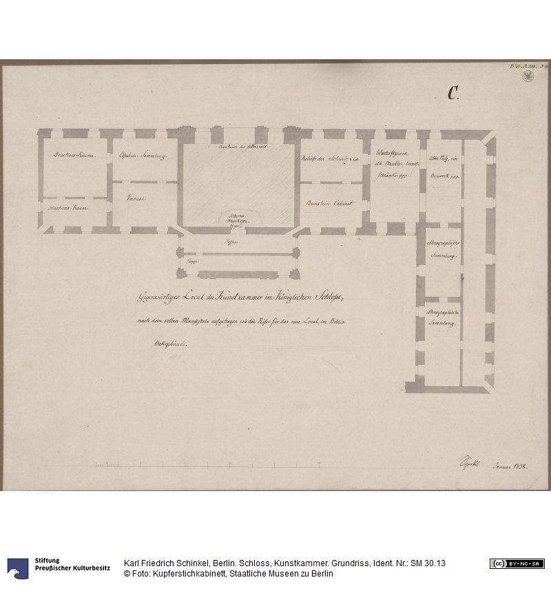 Ground plan of the Kunstkammer in the Berlin Palace by Karl Friedrich Schinkel, January 1838. It shows the spatial situation after the naturalia had been transferred to the newly founded university in 1810, the antiquities and coins to the Altes Museum, and the “Patriotic Antiquities” and Egyptian artifacts to Monbijou Palace. The ground plan reveals the emphases that would emerge in subsequent decades. Ethnography and craft, previously combined in the Ivory Cabinet, were now distributed over a number of rooms. The former Medals Cabinet was now occupied by “administrative spaces” for the new curator of the collection, Leopold von Ledebur, who would determine the essential form of the collection until its dissolution in the 1870s. Franz Kugler’s Beschreibung der in der Kgl. Kunstkammer zu Berlin vorhandenen Kunst-Sammlung (Description of the Art Collection in the Royal Kunstkammer of Berlin) from 1838 documents the holdings.