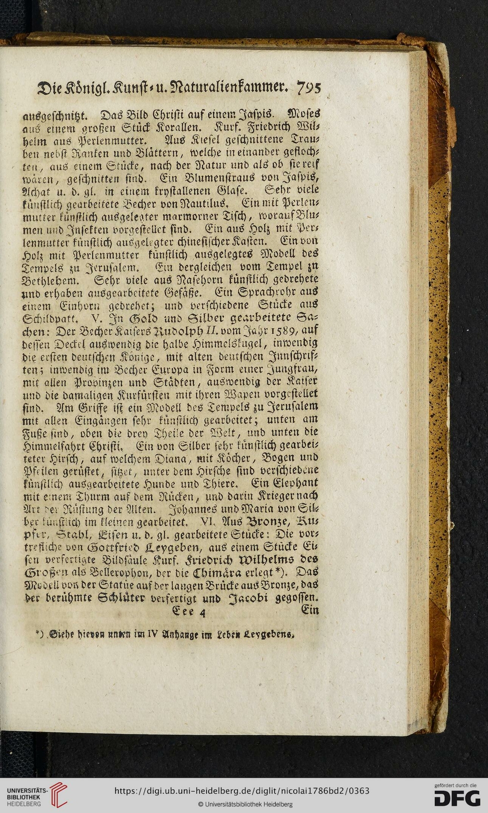 ausgeschnitzt. Das Bild Christi auf einem Jaspis. Moses/ aus einem großen Stück Korallen. Kurf. Friedrich Wil-/helm aus Perlenmutter. Aus Kiesel ausgeschnittene Trau-/ben nebst Ranken und Blättern, welche ineinander gefloch-/ten, aus einem Stücke, nach der Natur und als ob sie reif/ wären, geschnitten sind. Ein Blumenstrauß von Jaspis,/ Achat u. d. gl. in einem krystallenen Glase. Sehr viele/ künstlich gearbeitete Becher von Nautilus. Ein mit Perlen-/mutter künstlich ausgelegter marmorner Tisch, worauf Blu-/men und Insekten vorgestellet sind. Ein aus Holz mit Per-/lenmutter künstlich ausgelegter chinesischer Kasten. Ein von/ Holz mit Perlenmutter künstlich ausgelegtes Modell des Tempels zu Jerusalem. Ein dergleichen vom Tempel zu/ Bethlehem. Sehr viele aus Nasehorn künstlich gedrehte/ und erhaben ausgearbeitete Gefäße. Ein Sprachrohr aus/ einem Einhorn gedrehet; und verschiedene Stücke aus/ Schildpatt. V. In Gold und Silber gearbeitete Sa-/chen: Der Becher Kaisers Rudolph II. vom Jahr 1589, auf/ dessen Decken auswendig die halbe Himmelskugel, inwendig/ die ersten deutschen Könige, mit alten deutschen Inschrif-/ten; inwendig im Becher Europa in Form einer Jungfrau,/ mit allen Provinzen und Städten, auswendig der Kaiser/ und die damaligen Kurfürsten mit ihren Wapen vorgestellet/ sind. Am Griffe ist ein Modell des Tempels zu Jerusalem/ mit allen Ergänzungen sehr künstlich gearbeitet; unten am/ Fuße sind, oben die drey Theile der Welt, und unten die/ Himmelfahrt Christi. Ein von Silber sehr künstlich gearbei-/teter Hirsch, auf welchem Diana, mit Köcher, Bogen und/ Pfeilen gerüstet, sitzet, unter dem Hirsche sind verschiedene/ künstlich ausgearbeitete Hunde und Thiere. Ein Elephant/ mit einem Thurm auf dem Rücken, und darin Krieger nach/ Art der Rüstung der Alten. Johannes und Maria von Sil-/ber künstlich im kleinen gearbeitet. VI. Aus Bronze, Ku-/pfer, Stahl, Eisen u. d. gl. gearbeitete Stücke: Die vor-/treffliche von Gottfried Leygeben, aus einem Stücke Ei-/sen verfertigte Bildsäule Kurf. Friedrich Wilhelms des/ Großen als Bellerophon, der die Chimaera erlegt *). Das Modell von der Statue auf der langen Brücke aus Bronze, das/ der berühmte Schlüter verfertigt und Jecobi gegossen.