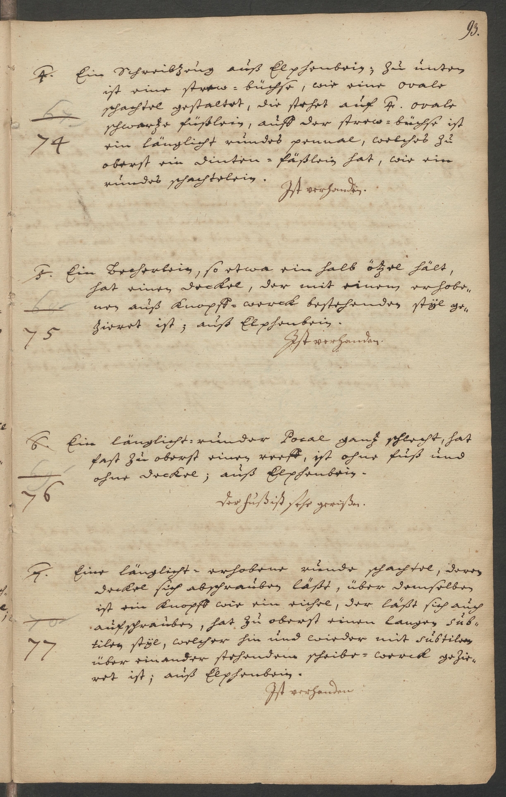 6.69 76 Ein länglicht-runder Pocal gantz schlecht, hat/ fast zu oberst einen reeff, ist ohne fuß und/ ohne Deckel; auß Elphenbein./ Der Fuß ist sehr gerißen./