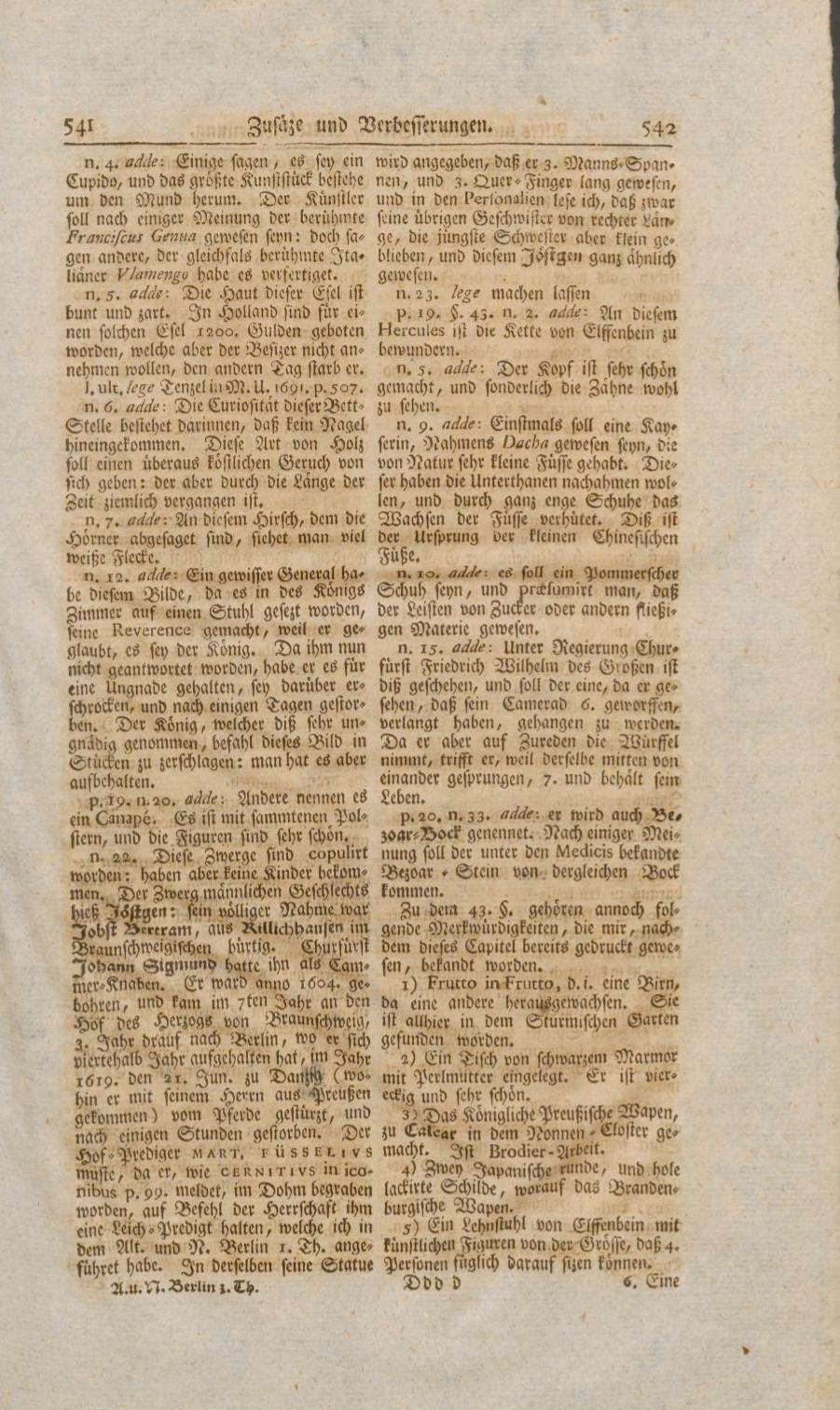 n. 22. Diese Zwerge sind copulirt worden: haben aber keine Kinder bekommen. Der Zwerg männlichen Geschlechts hieß Jöstgen: sein vollständiger Nahme war Jobst Bertram, aus Rillichhausen im Braunschweigischen bürtig. Churfürst Johann Sigmund hatte ihn als Cammer-Knaben. Er ward anno 1604. gebohren, und kam im 7ten Jahr an den Hof des Herzogs von Braunschweig, 3. Jahr drauf nach Berlin, wo er sich viertehalb Jahr aufgehalten hat, im Jahr 1619. den 21. Jun. zu Danzig (wohin er mit seinem Herrn aus Preußen gekommen) vom Pferde gestürzt, und nach einigen Stunden gestorben. Der Hof-Prediger MART. FÜSSELIVS muste, da er, wie CERNITIVS in iconibus p. 99. meldet, im Dohm begraben worden, auf Befehl der Herrschaft ihm eine Leich-Predigt halten, welche ich in dem Alt. und N. Berlin 1. Th. angeführet habe. In derselben Statue seine Statue wird angegeben, daß er 3. Manns-Spannen, und 3. Quer-Finger lang gewesen, und in den Personalien lese ich, daß zwar seine übrigen Geschwister von rechter Länge, die jüngste Schwester aber klein geblieben, und diesem Jöstgen ganz ähnlich gewesen.