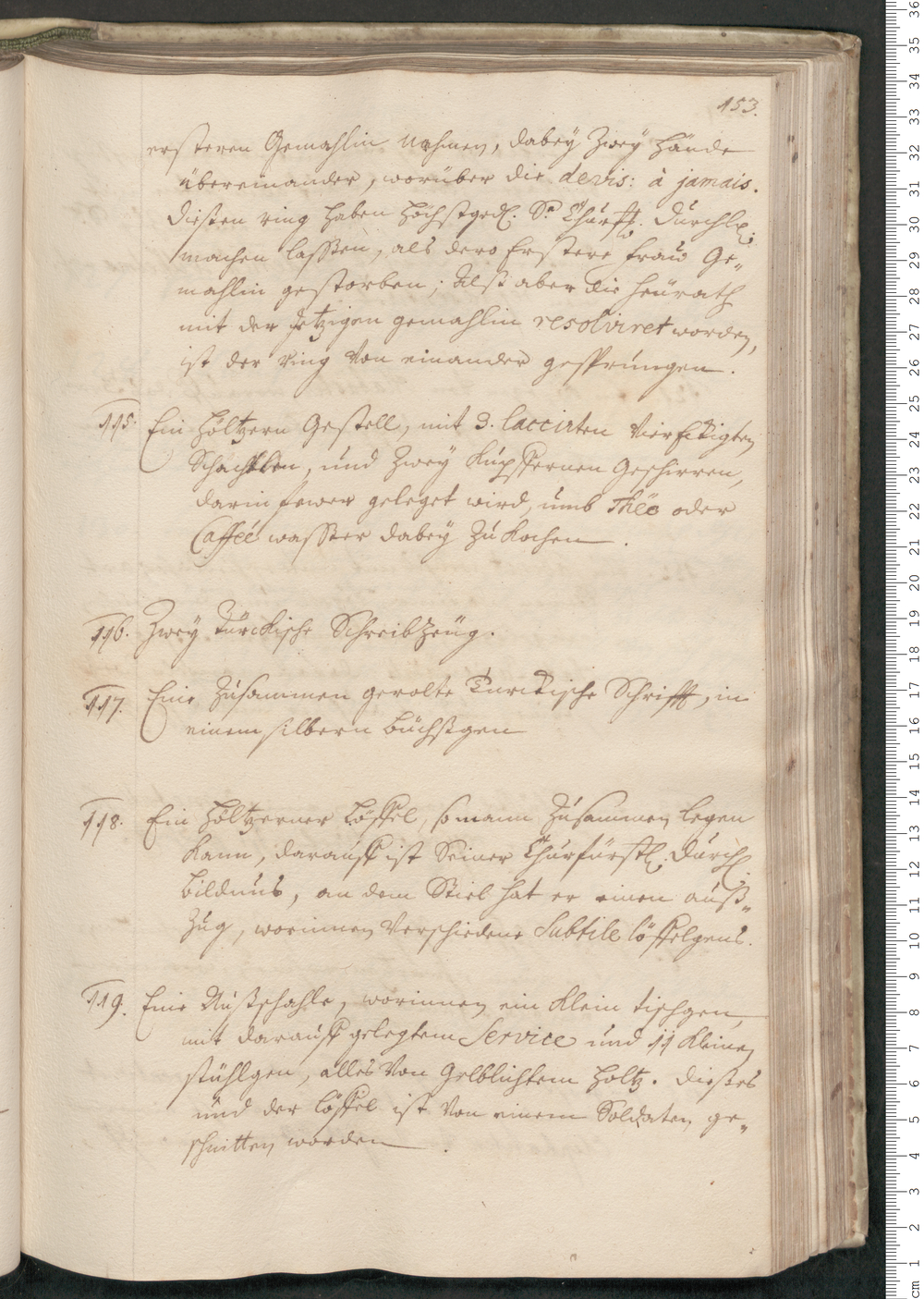 119. Eine Nußschale, worinnen ein klein tischgen,/ mit darauff gelegtem Service und 11 kleine/ stuhlgen, alles von gelblichem holtz. Dieses/ und der löffel ist von einem Soldaten ge=/schnitten worden.