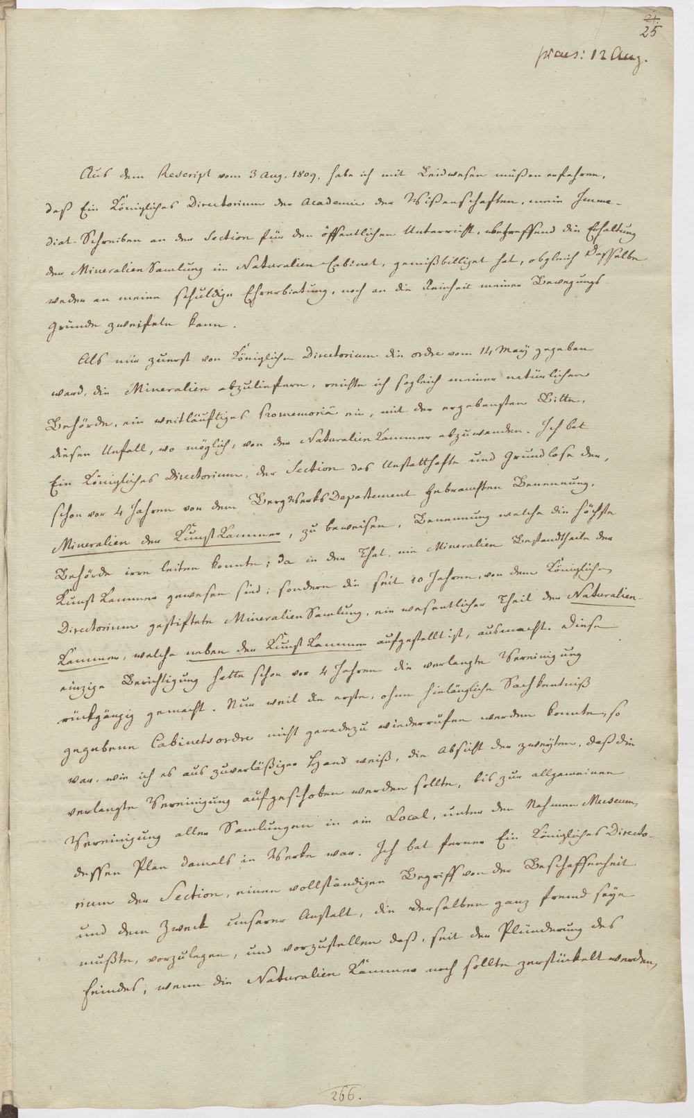 Aus dem Rescript vom 3 Aug. 1809. habe ich mit Leidwesen müßen erfahren, / daß Ein Königliches Directorium der Academie der Wissenschaften mein Imme- / diat-Schreiben an der Section für den öffentlichen Unterricht, betreffend die Erhaltung / der Mineralien Samlung im Naturalien Cabinet, gemißbilliget hat, obgleich Dasselbe / weder an meine schuldige Ehrerbietung, noch an die Reinheit meiner Bewegungs- /gründe zweifeln kann./