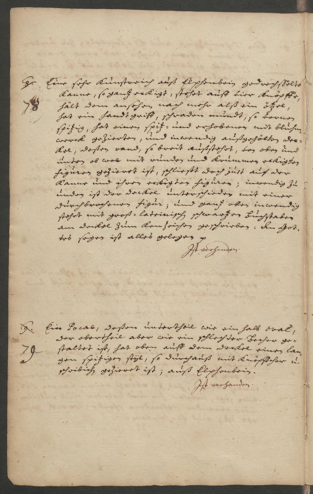 8.7178 Eine sehr kunstreich auß Elphenbein gedrechsselte/ Kanne, so gantz eckigt, stehet auff vier Knöpffe,/ hält dem ansehen nach mehr alß ein ötzel,/ hat ein handtgriff, schraden mundt, so vornen/ spitzig, hat einen spitz= und erhobenen mit bluhm=/ werck gezierten, und inwendig außgehölten dec=/kel, deßen rand, so breit außstehet, von oben und/ unten ob wol mit runden und krummen eckigten/ figuren gezieret ist, schließt doch just auf der/ Kanne und ihren eckigten figuren; inwendig zu/ unden ist der deckel unterschieden mit einer/ durchbrochenen figur; und gantz oben inwendig/ stehet mit groß=lateinisch schwartzen Buchstaben/ am Deckel zum Kenzeichen geschrieben: An Gottes segen ist alles gelegen p/ Ist vorhanden/