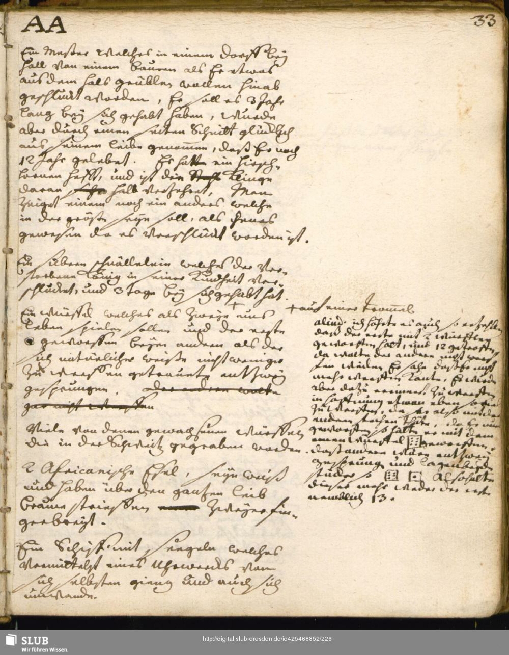 [Absatz am rechten Rand:] aliud. ich höhrte es auch so erzehlen daß der erste mit 2 Würfflen geworffen hatt, und 12 getroffn da wolte der andere nicht werffen weilen Er sahe daß Er nicht mehr werfen konnte, Er [wurde?] aber dazu erinnert zu werffen in hoffnung etwan eben so viel zu werffen, da [;] also mit der andrn stehen thäte, da Er nun geworfen so hätte er mit dem einen Würffel [;] geworfen. das andern warn entzwey gesprungen und lagen beyde stücke so [;] so hatte dieser mehr weder der erste nemblich 13.