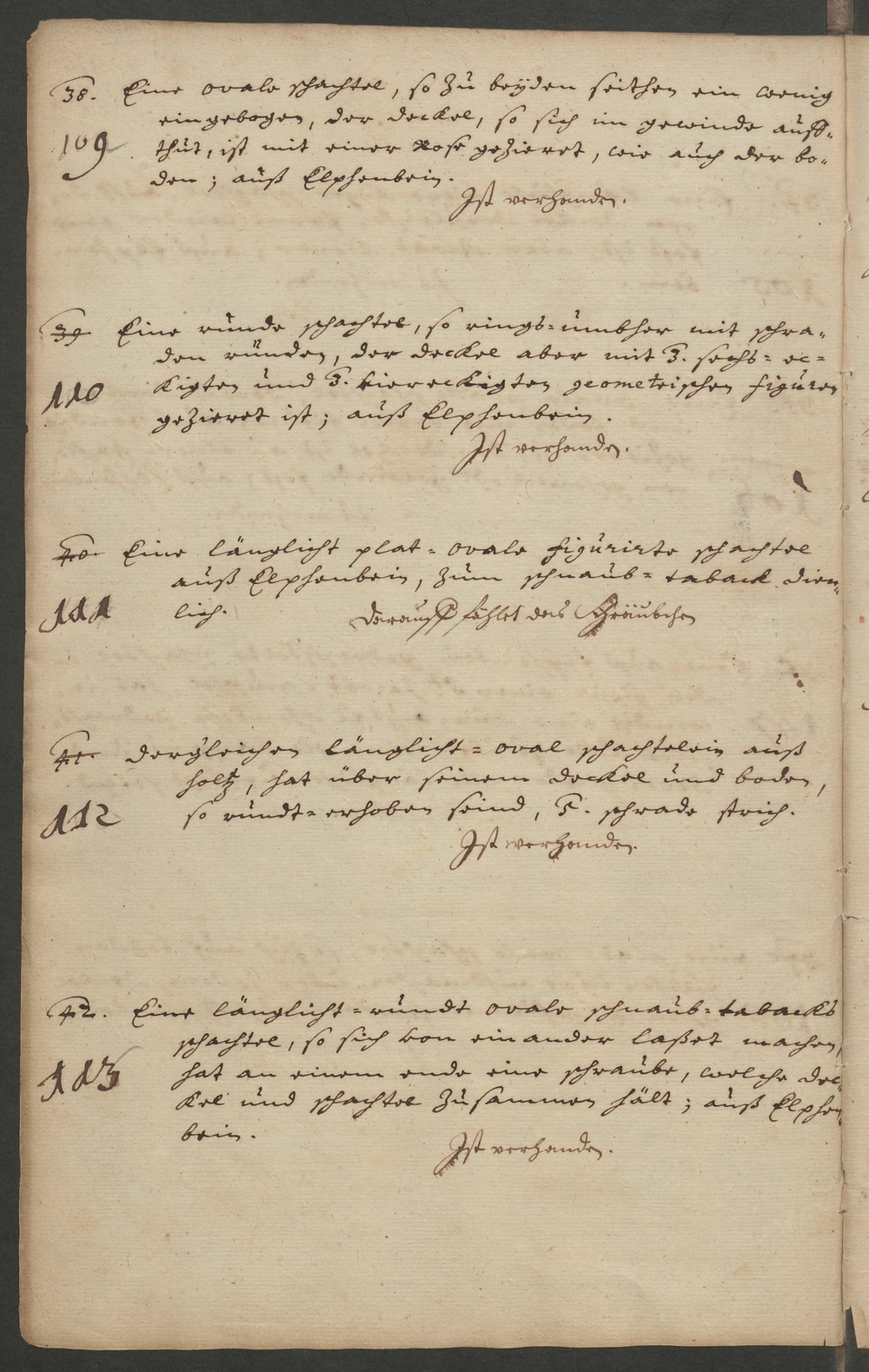42. 106 113 Eine länglicht=rundt ovale schnaub-tabacks/ schachtel, so sich von einander laßet machen,/ hat an einem ende eine schraube, welche dec=/kel und schachtel zusammen hält; auß Elphen=/bein./ Ist vorhanden