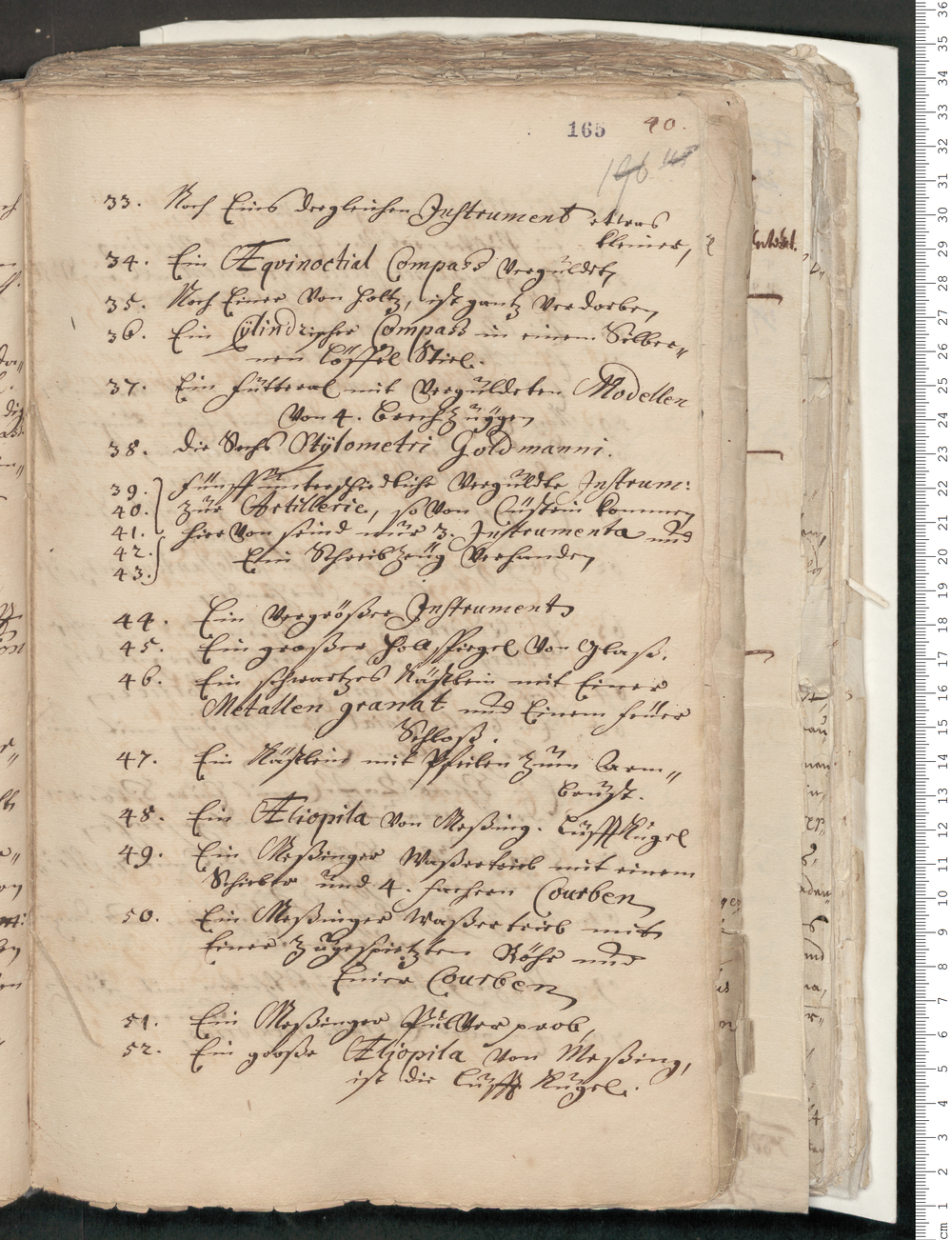 39. 40. 41. 42. 43. Fünff unterschiedliche verguldte Instrum:/ zur Artillerie, so von Cüstrin kommen/ hier von seind nur 3. Instrumenta und/ Ein Schreibzeüg vorhanden/