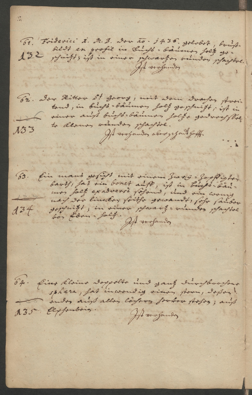 61. 125 132 Friderici I. M. B. der ao 1436. gelebet, brust=/bildt en profil in Buchs=bäumen holtz ge=/schnitzt; ist in einer schwartzen runden schachtel./ Ist vorhanden/