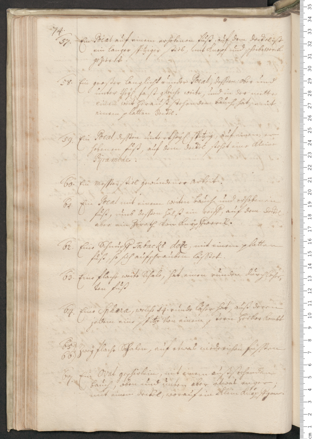 67. Ein Oval geschirlein, mit einem außstehenden/ Bauch, oben und unten aber etwas enger;/ mit einem Deckel, worauf ein klein Knöpfgen.