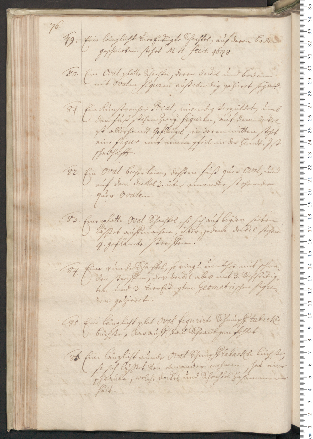 86. Eine länglicht runde oval Schnupftabacks=Büchse,/ so sich läsßet von niemand nehmen, hat eine/ schraube, welche Deckel und Schachtel zusammen/ hält.