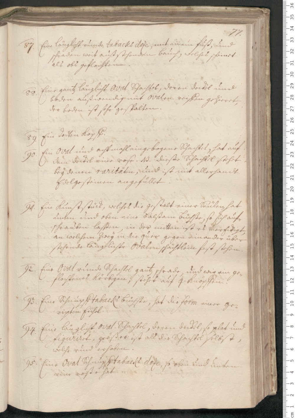 88. Eine gantz länglicht oval Schachtel, deren deckel und/ boden außwendig mit ovalen reiffen gezieret,/ der boden ist sehr gesPalten/