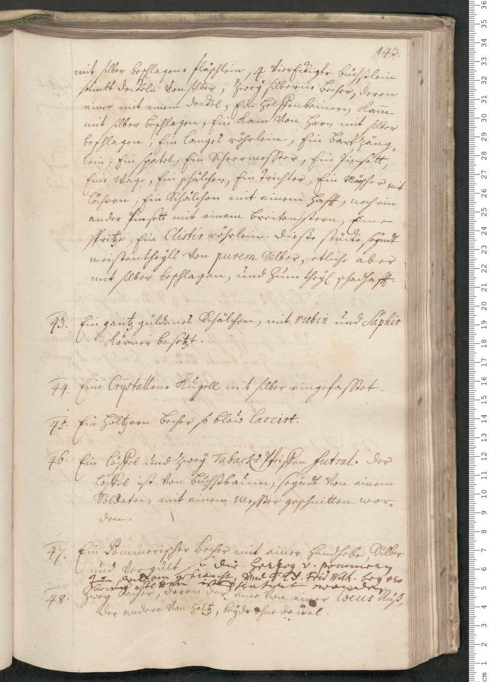 mit silber beschlagene fläschlein, 4. viereckigte büchslein/ sambt deckeln von silber, Zwey silberne Becher, deren/ einer mit einem Deckel, Ein Helffenbeinern Kamm/ mit silber beschlagen, Ein Kam von Horn mit silber/ beschlagen, Ein langes röhrlein, Ein Bartzäng=/lein, Ein spatel, Ein Scheermesßer, Ein Pinsett,/ Eine Wage, Ein schälchen, Ein Trichter, Ein Mörscher mit/ Löchern, Ein Schälchen mit einem Haft [?] noch ein/ ander Pinsett einem breiten stern [?], Eine spritze, Ein Clistir röhrchen. Dieße Stücke seyndt/ meistentheyls von purem Silber, etliche aber/ mit silber beschlagen, und Zum theyl schadhafft.