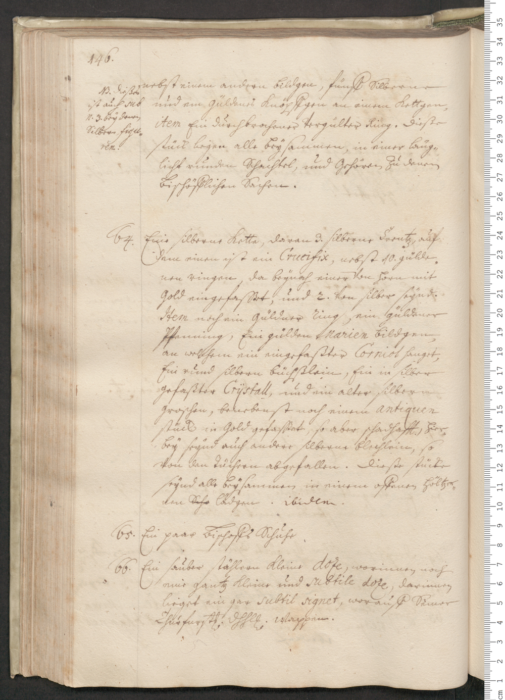 64. Eine silberne Kette, daran 3. silberne Kreutz, auf/ dem einen ist ein Crucifix, nebst 10 gülde=/nen ringen, da beynah einer von Horn mit/ Gold eingefasßet, und 2. von silber seynd./ Item noch ein güldner Ring, ein güldener/ Pfennig, Ein gülden Marien bildgen,/ an welchem ein eingefaßter Carniol hanget,/ Ein rund silbern Büchslein, Ein in silber/ gefaßter Crystall, und ein alter silbern/ groschen, benebenst noch einem antiquen/ stück in Gold gefasßet, so aber schadhafft, Hier=/bey seynd auch andere silberne blechlein, so/ von den Tüchern abgefallen. Diese Stücke/ seynd alle beysammen in einem offenen hölzter=/nen lädgen. [ander Tinte:] ibidem/