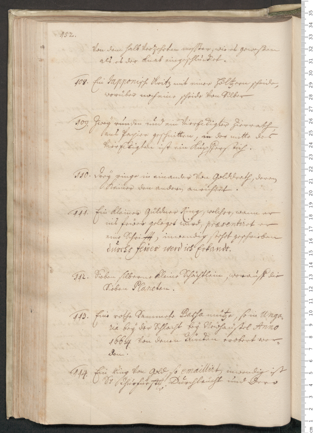110. Ein kleiner Güldener Ring, welcher, wann er/ ins fewer geleget wird, praesentirt er/ eine Schrifft, inwendig stehet geschrieben/ durchs fewer werd ich erkandt./