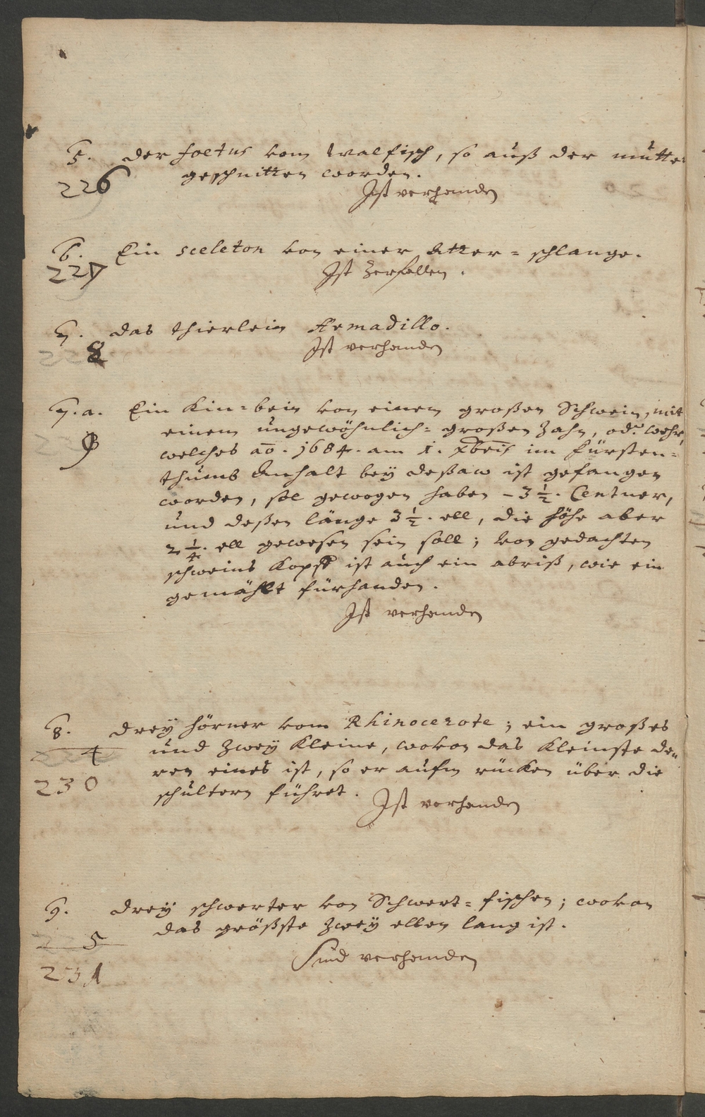 8. 224 230 Drey hörner vom Rhinocerote; ein großes/ und zwey kleine, wovon das kleinste da=/von eines ist, so er aufm rücken über die/ schulter führet./ Ist vorhanden./