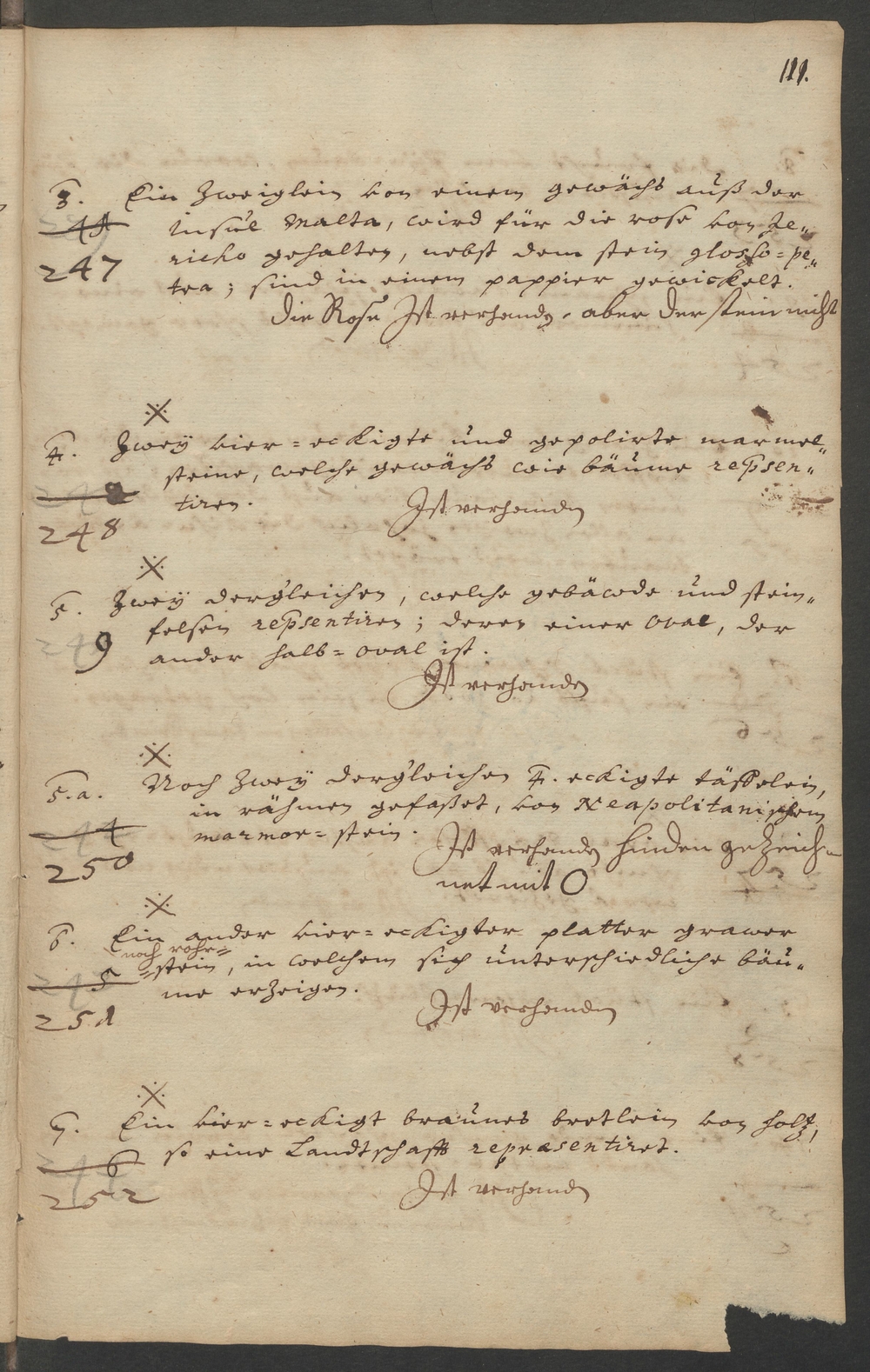 X/ 5.a. 244 250 Noch zwey dergleichen 4. eckigte täffelein,/ in rähmen gefaßet, von Neapolitanischem/ Marmor=stein./ Ist vorhanden hinden gezeich=/net mit O/