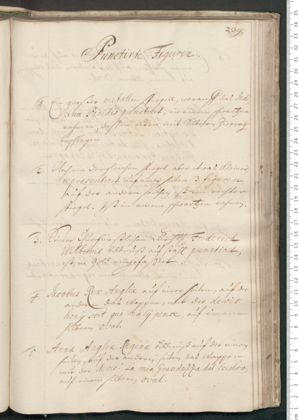 5. Annae Angliae Reginae bildnüß auf der einen/ seiten, auf der andern seiten das Wappen/ mit der devis. [oder: Doppelpunkt] La mia Grandezza dal Eccelso;/ auf einem silbern oval.