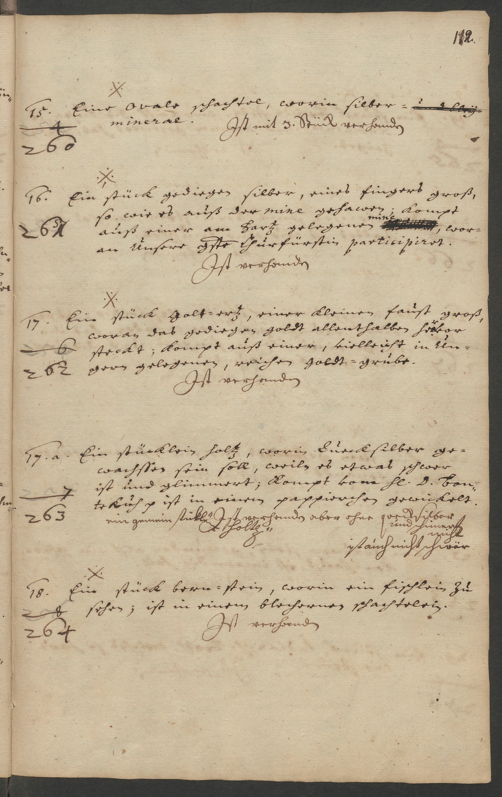 X/ 17. 256 262 Ein Stück golt=ertz, einer kleinen faust groß,/ woran das gediegen goldt allenthalben hervor/ streckt; kompt auß einer, vielleicht in Un=/garn gelegenen, reichen goldt=grube./ Ist vorhanden./