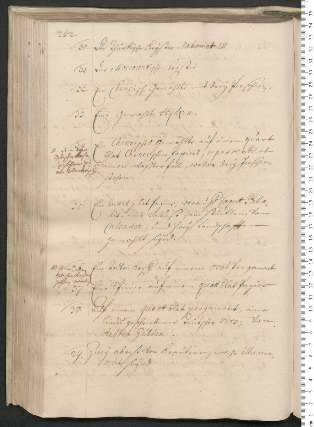 35. Ein Quart plat Papier, worauft Caput Palla=/dis, eine [mauß?], ein stücklein vom/ Calender, und Zweÿ Landschaftten/ gemahlt seÿnd./